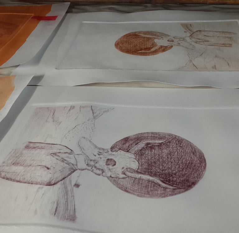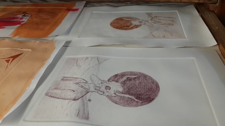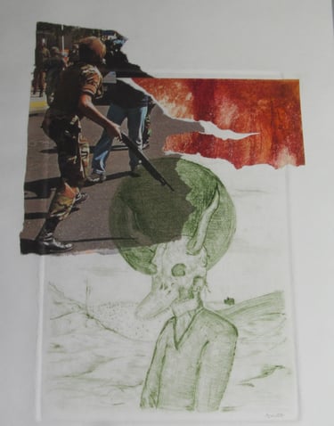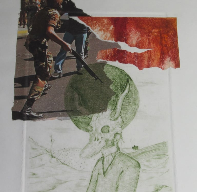 Open graphic series of landscapes and dystopian scenarios that pose the return of nature on human beasts, design and printing using graphic techniques of reproduction, dry-point engravings, etching, screen printing, woodcut, once the spaces are designed, some works expand into space web connecting the framed graphic work that it has in a portal to the web space where I could explore within the space represented in the work graph by DCOT.