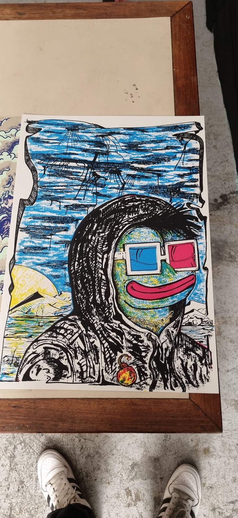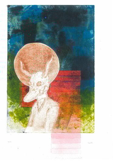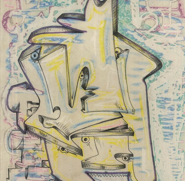 1 of 1 Printed in silkscreen with pastels, then intervened with ink, looking for shapes such as eyes and angles that form faces in the geometric figure you build from stains and chance.