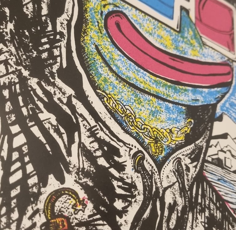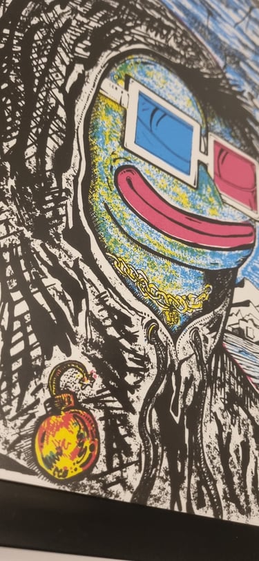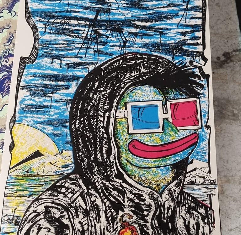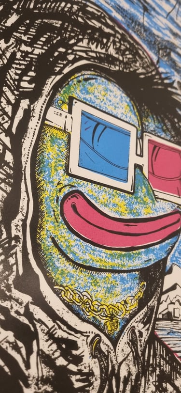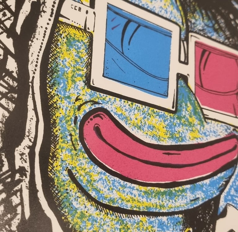 Hand-drawn silkscreen, 3-layer print at 108 Workshop, video production by Filmkilo, artwork by DCOT, 2024 Nouns Amigos Art Residency Bogotá. Unsigned prints, undistributed.