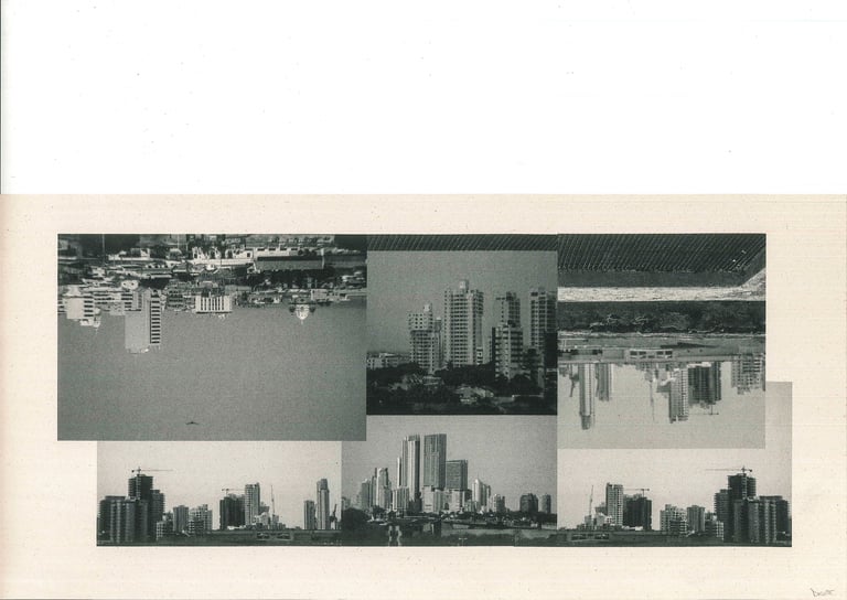 Screen print on paper, collage of photographs taken in different Colombian cities that create a composition that simultaneously interweaves urban spaces using a dotted halftone pattern, conceptually uniting different points. 2018